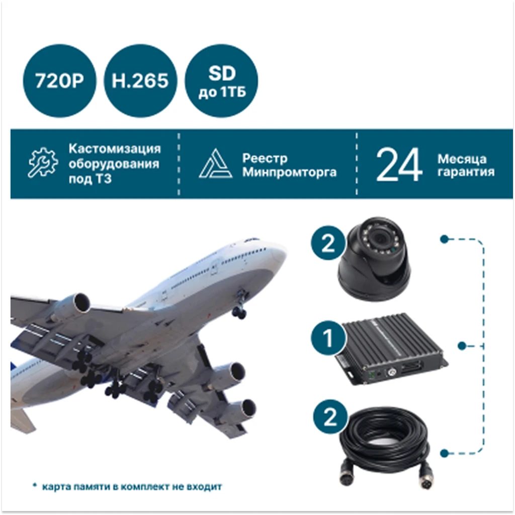 NSCAR ST201_SD — комплект видеонаблюдения, специально адаптированный для установки на воздушный транспорт: самолёты, вертолёты и спецтехнику МЧС. Система фиксирует происходящее в HD-качестве, запись осуществляется на SD-карту памяти (до 512 ГБ). Компактный регистратор и защищённые камеры обеспечивают надёжность работы в сложных условиях эксплуатации.